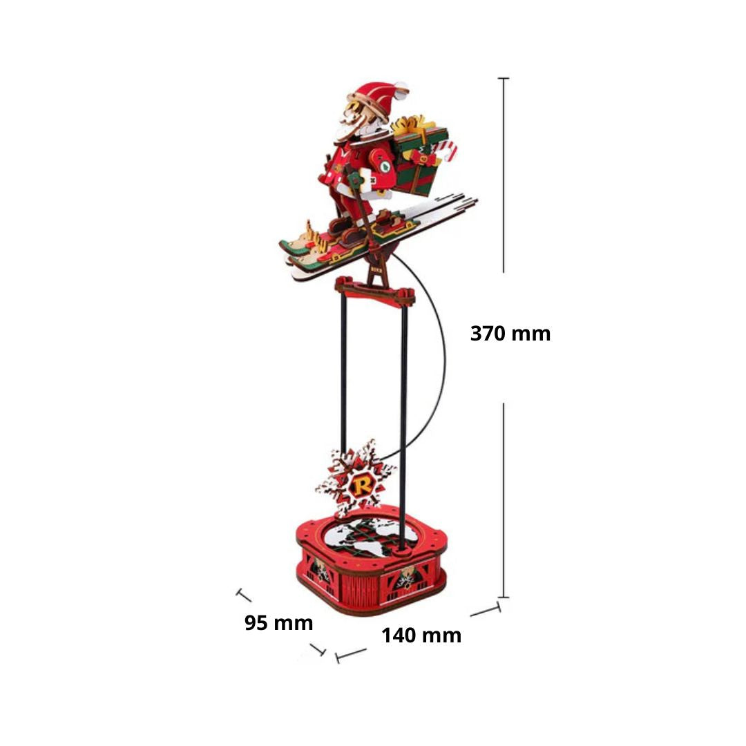 Le modèle capture la posture dynamique du Père Noël en plein élan, skis aux pieds et sac de cadeaux sur le dos, prêt pour sa tournée hivernale. Avec ses bras qui se balancent doucement à chaque oscillation, il évoque la glisse, la joie, la légèreté.