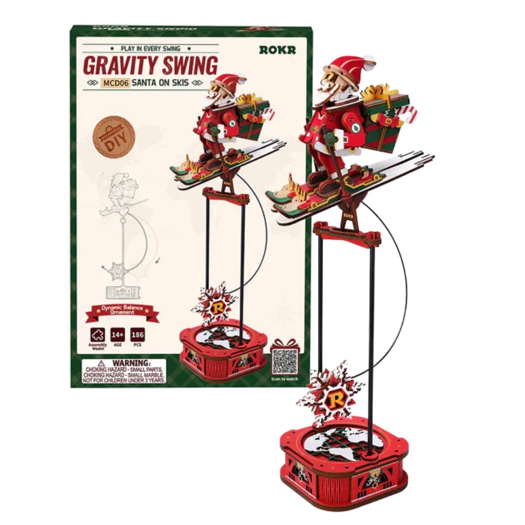 Une structure à pendule ingénieuse : fixée sur une base stable, avec un contrepoids décoré en flocon de neige pour maintenir l’équilibre. À chaque mouvement, Santa on Skis rappelle que la physique peut aussi être magique.